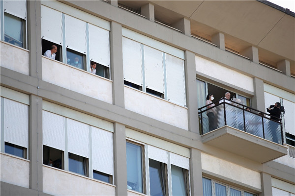 當地時間7月11日,在意大利羅馬,教宗方濟各在醫院的陽台上主持禱告。他此前接受結腸手術,仍在恢復中。