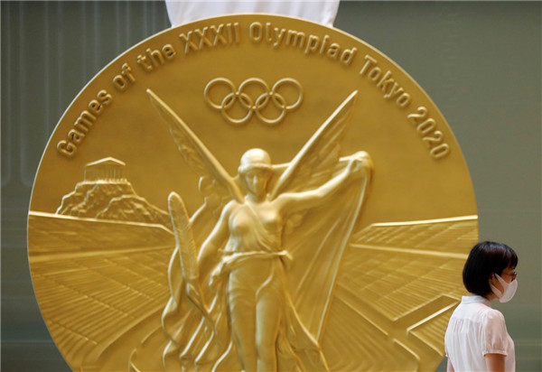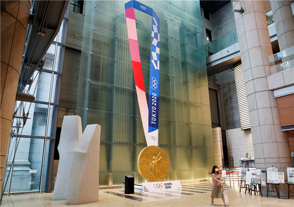 當地時間7月14日,在日本東京,人們經過一處按照東奧獎牌的樣子進行放大及複製的設施。