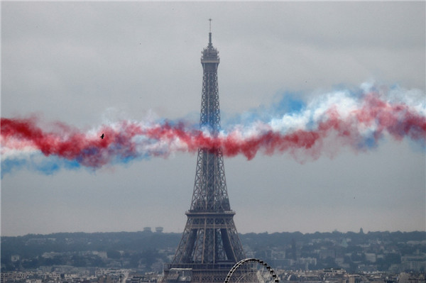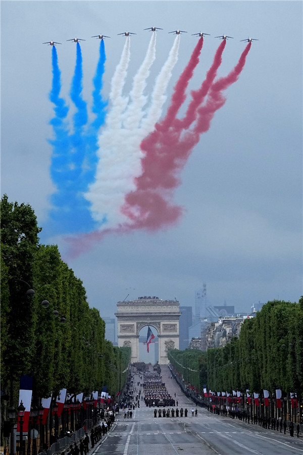 當地時間7月14日,在法國巴黎舉行的巴士底日慶祝活動中,法國空軍的阿爾法戰機飛過艾菲爾鐵塔等建築。