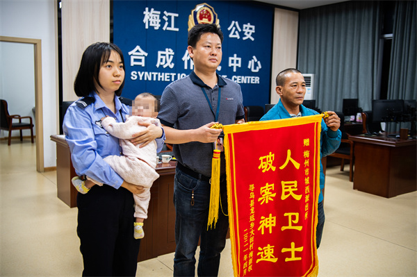 9個月的女兒「小雅」被成功解救後,梅先生激動地向公安機關送上「人民衛士 破案神速」的錦旗。