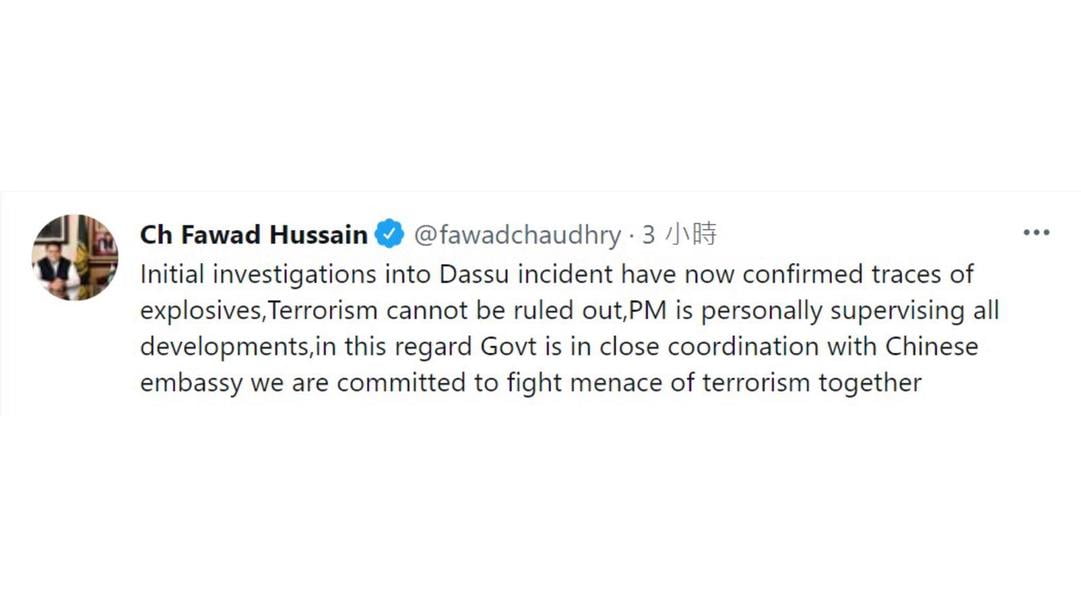 巴基斯坦科技部長喬杜里周四在社交網站表示,初步調查顯示現場有爆炸物痕跡,不能排除恐怖主義活動的可能性,又指總理伊姆蘭汗親自跟進事態發展,當局亦會與中國大使館密切協調,致力共同打擊恐怖主義威脅。