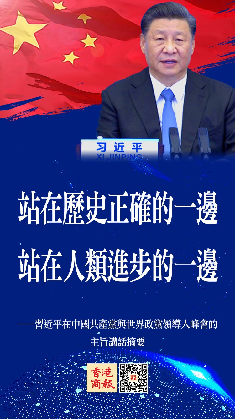 習近平強調,中國共產黨願繼續同各國政黨和政治組織一道,站在歷史正確的一邊,站在人類進步的一邊,為推動構建人類命運共同體、建設更加美好的世界作出新的更大貢獻!