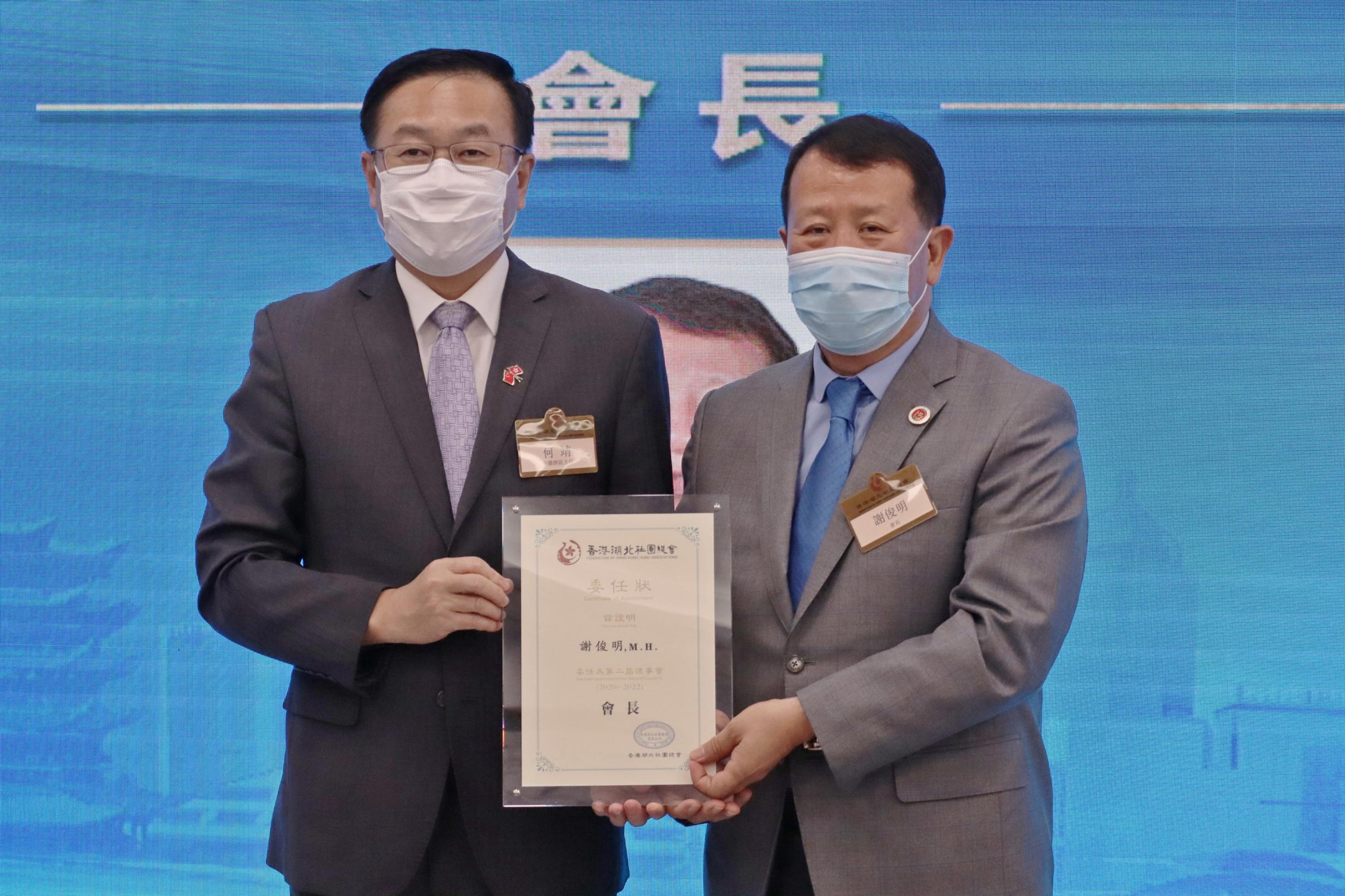 於香港會場 何靖(左)頒發會長委任狀予謝俊明(右)。