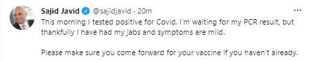 英國衛生大臣賈偉德(圖)周六在推特上表示,自己新冠檢測呈陽性。