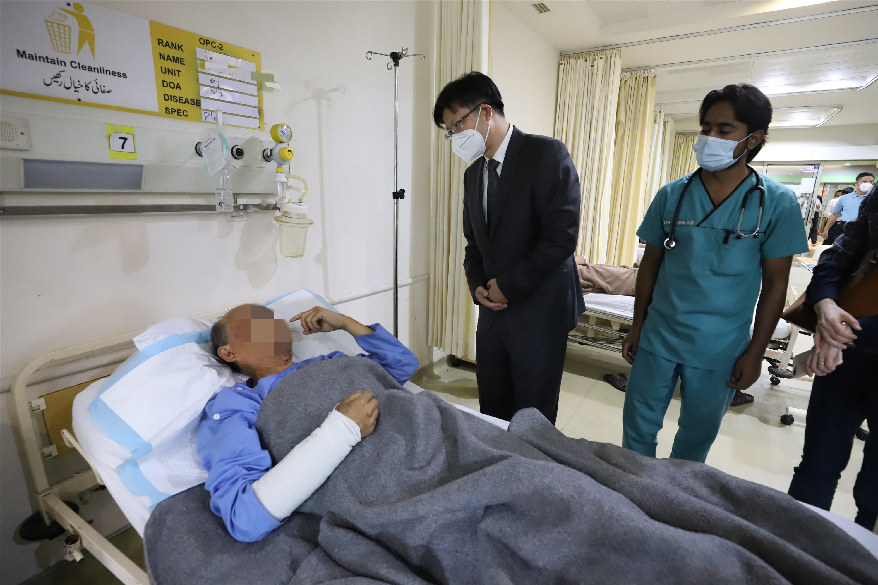 7月16日下午,中國赴巴基斯坦跨部門聯合工作組組長、外交部涉外安全司副司長吳偉(左二),同中國駐巴基斯坦大使農融一同趕赴巴首都附近的陸軍醫院,看望和慰問在達蘇恐怖襲擊事件中受傷的中方人員,了解每名傷員的病情和救治情況。