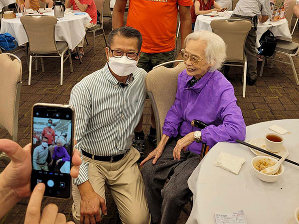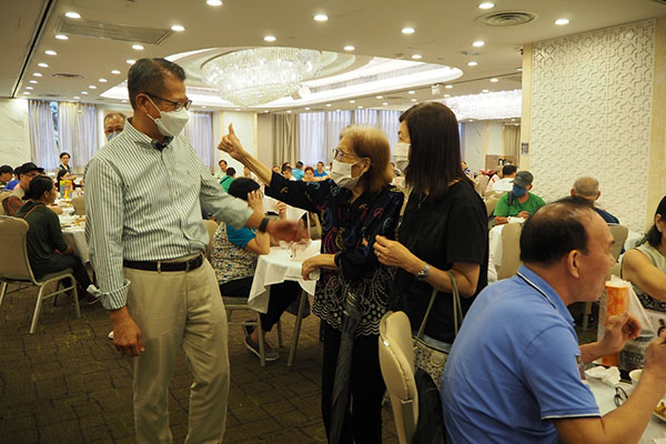 17日,陳茂波到香港仔飲早茶時與街坊閒話家常,聽大家對消費券的意見。
