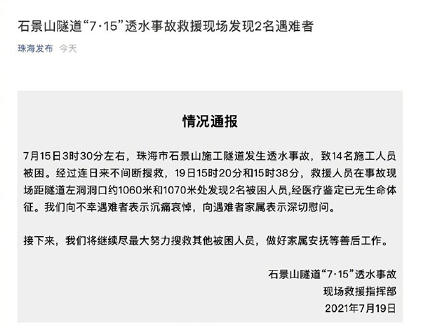 珠海石景山隧道「7·15」透水事故現場救援指揮部發布消息,19日15時20分和15時38分,救援人員在事故現場距隧道左洞洞口約1060米和1070米處發現2名被困人員,經醫療鑑定已無生命體徵。現場救援指揮部表示,將繼續盡最大努力搜救其他被困人員,做好善後工作。