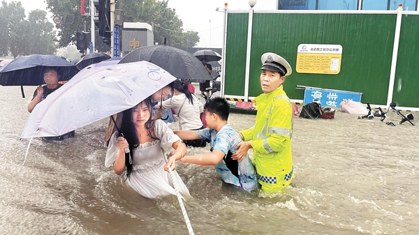 20日傍晚鄭州市民在暴雨中趟水前行。中新社