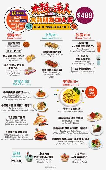 在美食上,廚師以遊戲為主題打造多款美食,當中包括最具人氣的《咚哢二人餐》及《太鼓朋友四人餐》。除了多款主食可供選擇外,隨餐更附送指定期間限定精品。除套餐外,更特別製作重點甜品《太鼓敲FUN蛋糕》,此甜品由官方獨家授權,以遊戲靈魂人物「小咚」及「小哢」外貌為藍圖製作而成。在享用蛋糕之前,小朋友可用附送的小木鎚敲擊蛋糕表面,與「小咚」及「小哢」打招呼,貫徹體驗成為太鼓達人之樂趣。(記者:雲遜)