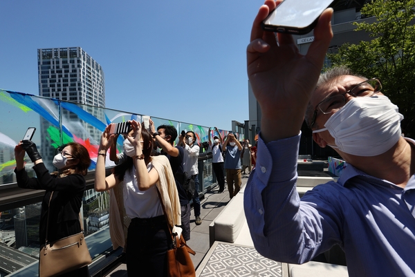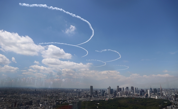 在東京盤旋的「藍色衝擊波」於當天中午12點50分前後在國立競技場附近上空畫出五環。正午過後,逾500人聚集在國立競技場附近的人行道上,並拿出相機和手機等待。看到藍色機身後,響起歡呼聲。東京都中野區的高中生遠藤悠里(17歲)興奮地說:「這是一輩子難得一見的盛況。我想着一定要現場看。」