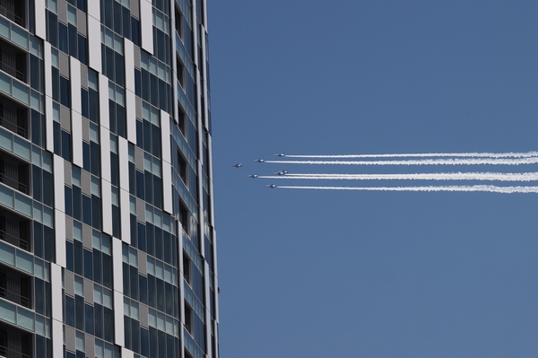 「藍色衝擊波」上次在東京都中心地區飛行是去年5月,當時向抗擊新冠疫情的醫護人員致敬和致謝。8月24日殘奧會開幕式當天也將飛行。