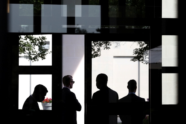 當地時間7月15日,在美國華盛頓,安保人員等待正在訪美的德國總理默克爾抵達德國大使官邸。