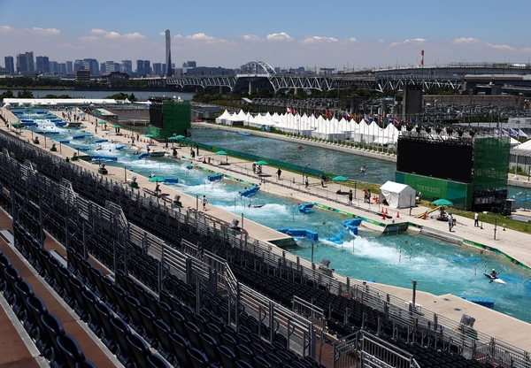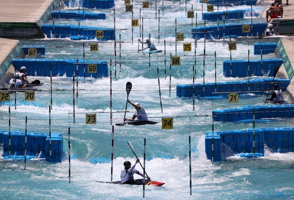 當地時間7月17日,在日本東京,運動員們在2020年東奧葛西皮划艇激流迴旋中心進行訓練。