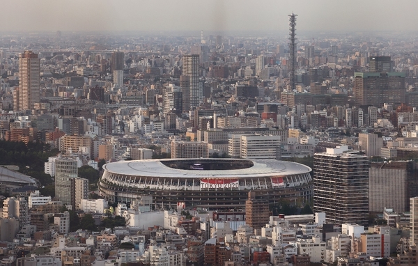 當地時間7月19日,在日本東京,從涉谷天空觀景台拍攝的2020年東奧的主會場—東京國立競技場。