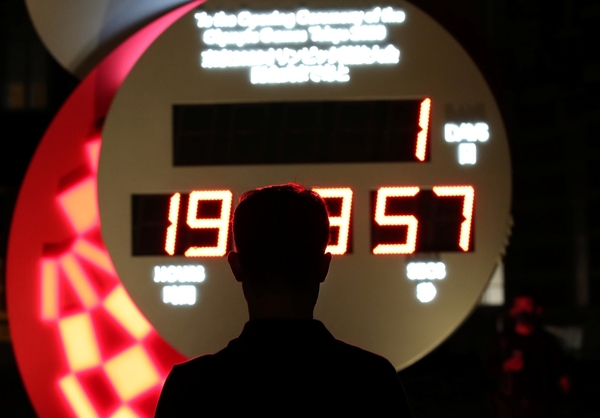當地時間7月22日,在日本東京,人們在觀看東奧開幕的倒計時鐘。距離東奧開幕僅剩1天。(編譯:徐浩 圖源:路透社)