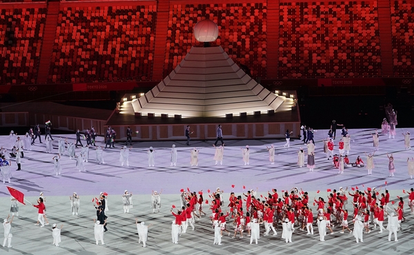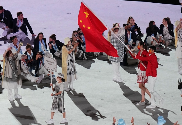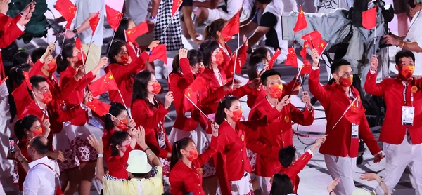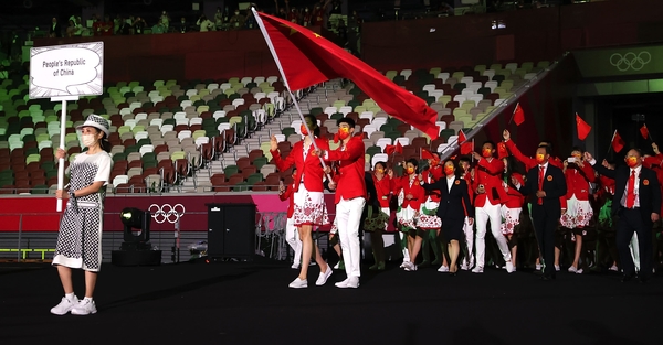 2021年7月23日,東京奧運會開幕式在日本新國立競技場舉辦。中國代表團於第110順位邁入主場館,擔任旗手的分別是女排運動員朱婷、跆拳道運動員趙帥。