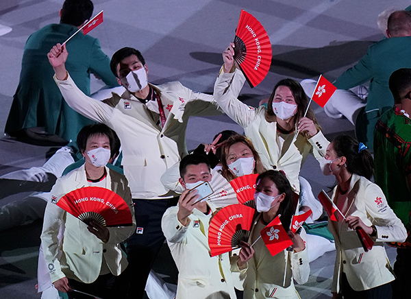 香港代表團緊接葡萄牙登場,在206隊中排第170,由男子花劍隊張家朗,偕羽毛球「三朝元老」謝影雪一同持旗。今晚將出戰女子4X100米自由泳接力初賽的何南慧、楊珍美,以及備戰下周個人賽的泳隊星將何詩蓓亦隨團亮相。