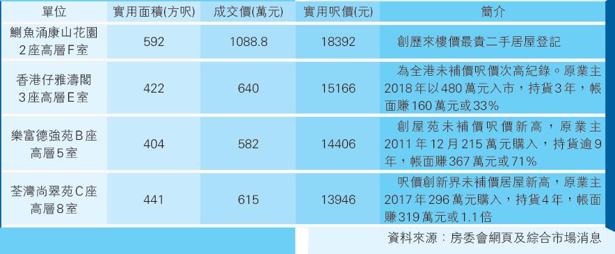 黃竹坑雅濤閣三房戶最近亦以1065萬元成交破頂。雅濤閣位置鄰近黃竹坑站,又擁有深灣遊艇會海景,在市場上十分吃香,最近雅濤閣1座高層A室,實用面積約591方呎,於自由市場獲承接,呎價約18020元,呎價創項目最高紀錄。據了解,是次成交是繼樂富富強苑、鰂魚涌康山花園及旺角富榮花園後,全港第4個樓價達千萬元或以上的居屋項目。