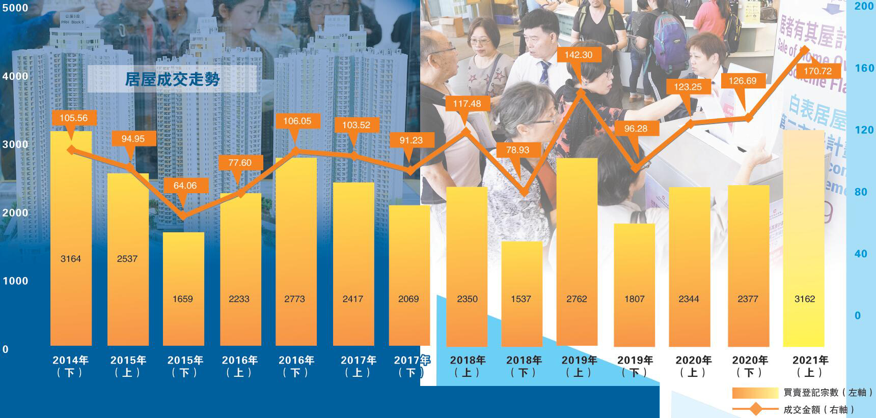 近期本港樓市成交明顯回升,二手居屋買賣亦十分暢旺。根據土地註冊處最新數據顯示,今年上半年錄得3162宗居屋二手買賣登記,較去年下半年的2377宗再升33%,創近六年半最多,成交金額約170億元,更創有紀錄以來最高。事實上,截至2020年為止,4年之間居屋升幅約37%,跑贏同期私樓約33%的升幅。想置業上車的市民繼續望樓興嘆!