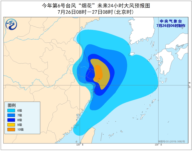 中新網7月26日電 據中央氣象台網站消息,今年第6號颱風「煙花」將於今天上午在浙江平湖到上海金山一帶沿海再次登陸,對此中央氣象台7月26日6時繼續發布颱風橙色預警: