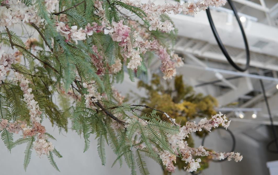 高樓底配以巨型花藝樹枝裝置,非但沒有壓迫感,更帶來一種清新逸趣。