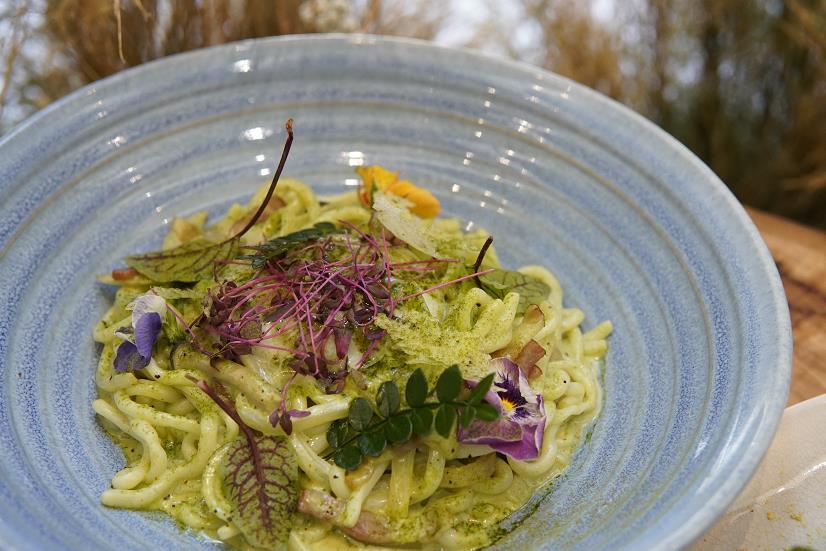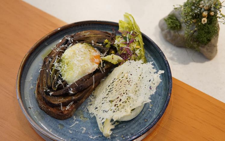 黃宇陽擁有16年入廚經驗,曾在法式餐廳、意式餐廳、酒店、咖啡店等工作,這些經歷豐富了他的視野,令他擅長設計不同國家的料理。他主張「多菜少肉」,拒絕以牛肉入饌,以及重視視覺效果,他說:「別人是先聲奪人,而我則強調先『色』奪人,食物好味之餘,賣相要夠精美,特別是顏色配搭,所以在考慮菜單時,會率先回憶哪些食材能與樹木的顏色呼應,再不斷嘗試各種配搭效果。」當食物上桌時,食客不難發現幕後的廚師有多注重形象美感。在侍應端來溫泉蛋牛油果大啡菇酸種麵包時,記者驚嘆這道菜式實在像真,主角大啡菇切成片狀,營造出「古樹」的木紋效果。輕盈清新又富含膳食纖維的蒟蒻麵,加上了顏色繽紛的食用花及水耕沙律菜,頓時生色不少,果然出「色」。 (記者:Ruth 攝影:Janice)