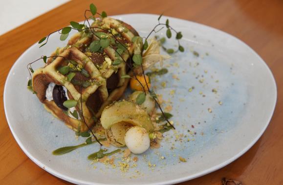 如何將想像中的抽象概念變成食物?老闆的奇思妙想往往難倒廚師。幸好曾於米芝蓮二星餐廳任職的主廚黃宇陽樂於接受挑戰,每季都會更新菜單,今次他設計兩款專為「百年輪」主題而設的特製窩夫:「鰻魚.卷滑蛋窩夫」及「開心果年輪窩夫」,擺盤精緻之餘,味道同樣有驚喜。前者雖然是鹹點窩夫,但窩夫本身帶微微的蛋甜香,配上日本蒲燒鰻魚、日本溫室青瓜和煙燻蘿蔔,甜鹹交融,口感豐富,但略嫌配菜煙燻蘿蔔過於重口味,搶去主角部分風頭。至於外形酷似樹木年輪的開心果窩夫,味道與擺盤同樣出色。直接混合開心果製成的窩夫,加上白玉小丸子及山形縣桃佐碟,再淋上加入鮮忌廉製成的開心果醬,輕輕一嘗,已感覺到醇厚細膩的美味配搭,甜度剛剛好。