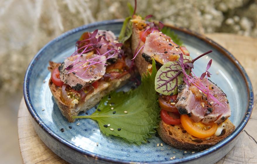 炙燒黃鰭吞拿魚酸種麵包,主廚巧妙地運用三種不同顏色的食材,視覺觀感一流。