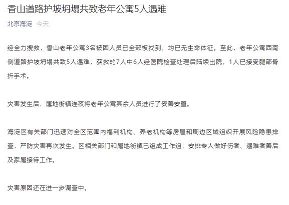 經全力搜救,香山老年公寓3名被困人員已全部被找到,均已無生命體徵。至此,老年公寓西南側道路護坡坍塌共致5人遇難,獲救的7人中6人經醫院檢查處理後陸續出院,1人已接受腿部骨折手術。