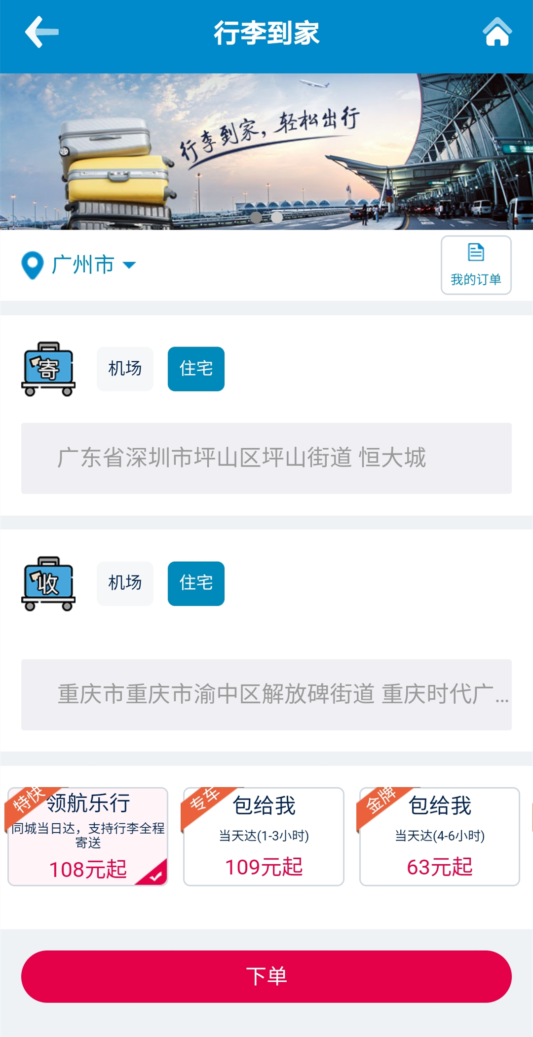 全程「行李到家」服務改變了原有傳統乘機出行方式,出遊、探親不再大包小包、跑來跑去、費時費力,旅客只需購買「行李到家」產品後在出發地將行李交給收運人員,行李就能安心送達指定目的地,真正實現「行李門到門」。
