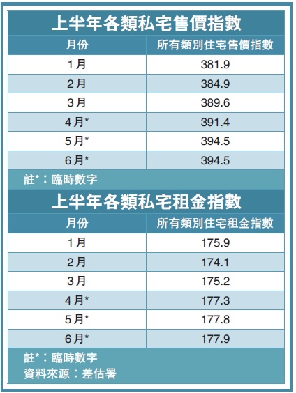 6月私人住宅租金指數報177.9點,按月升0.06%、按年跌1.22%。中小型單位住宅租金指數6月為181.8點,按月微升0.2%;大型單位則為144.8點,按月跌0.8%。