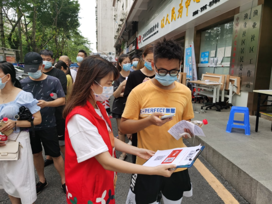 深圳市寶安區西鄉街道漁業社區黨委利用群眾做核酸檢測排隊時間宣傳推廣「學習強國」。供圖/西鄉街道