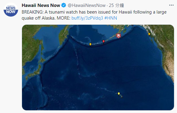 另據中國地震台網測定,北京時間7月29日14時15分在美國阿拉斯加州以南海域(北緯55.40度,西經158.00度)發生8.1級地震,震源深度10千米。當地政府已經發布海嘯預警,提醒居民避難。