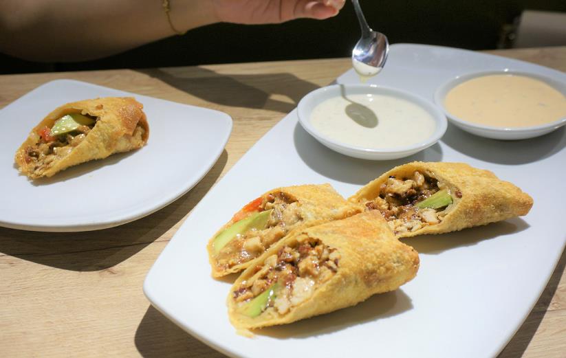 牛油果蛋卷(HK$84),以脆雲吞卷包著牛油果、雞肉、番茄、蒙特利芝士及果木燻煙肉,伴以沙律醬及香草沙律醬。
