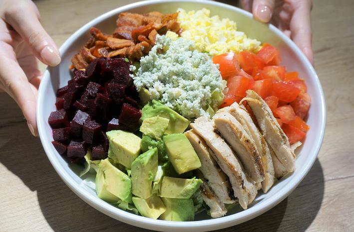 加州特色沙律(全份HK$148、半份$94),以果木燻煙肉、牛油果、雞肉、番茄、碎雞蛋、新鮮羅勒、紅菜頭及藍芝士製成,配上香草沙律醬,是健康之選。