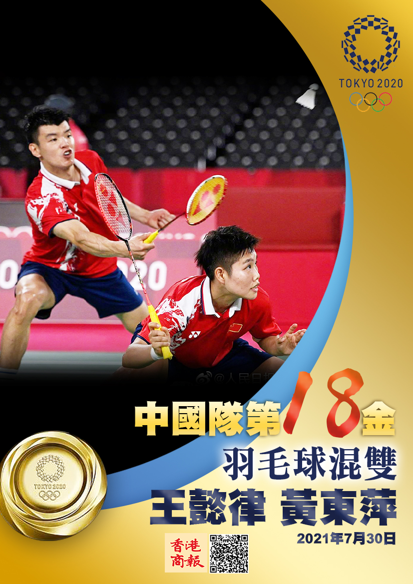 本港時間7月30日下午,中國羽毛球混雙組合黃東萍/王懿律在2020東京奧運會羽毛球混雙決賽中,2-1戰勝另一對中國組合鄭思維/黃雅瓊奪得金牌,中國羽毛球隊包攬了該項目的冠亞軍。
