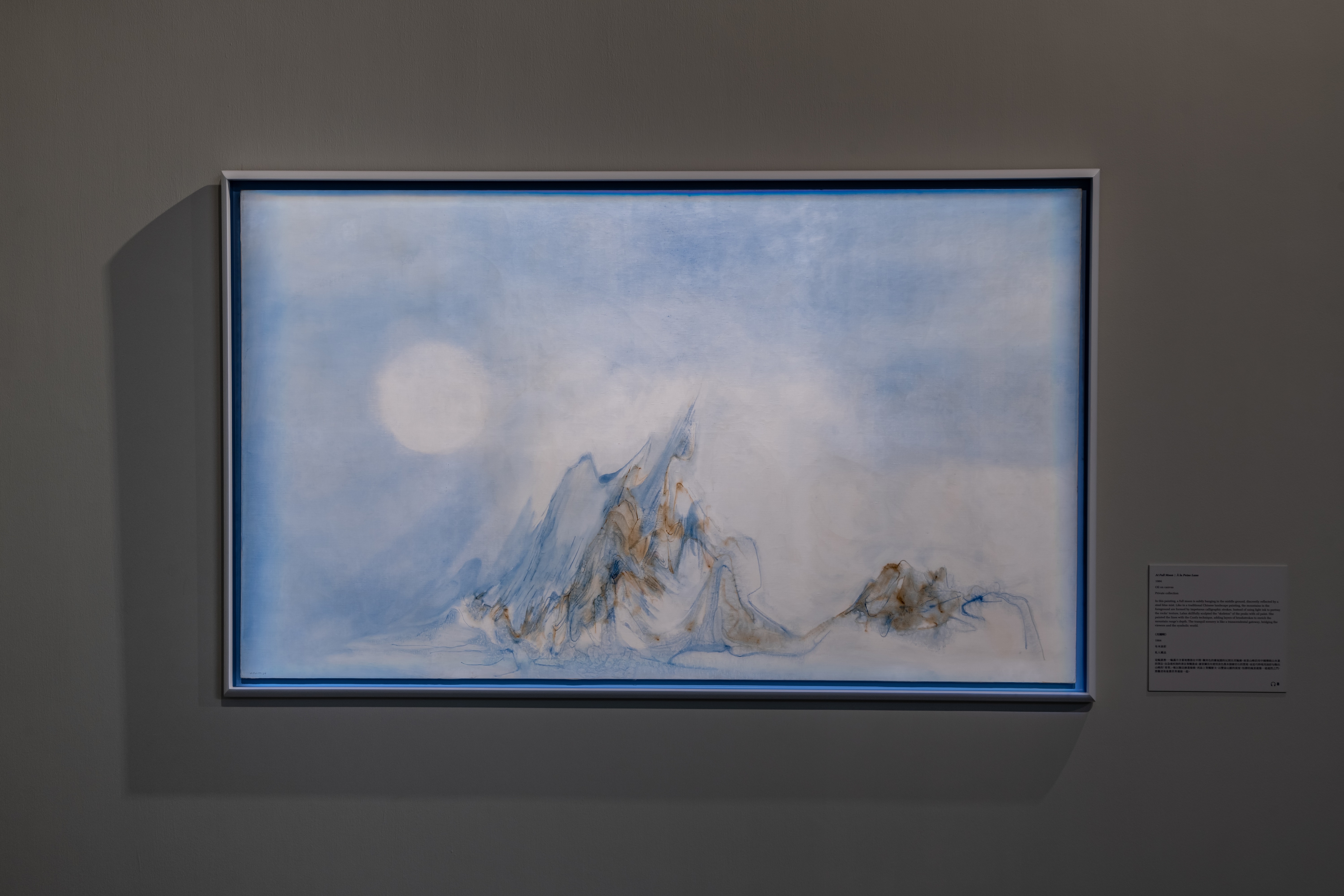 謝景蘭作品中的國畫元素從何而來?原來她曾遇到創作瓶頸而擱置繪畫一年,轉為關注南宋時期的山水美學,並受南宋畫家馬遠和夏圭的風格啟發。及後再創作油畫時刻意以大片留白、簡單的勾線和暈染,來刻畫日月、薄霧、山峰和岩層等自然元素,表現虛實相生、氣韻生動的審美意象。蒼白朦朧的色抹營造出河流、霧景或雲層的流動,反映藝術家平和豁然的心境。與早期奔放的表現主義比較,這個時期的創作多使用柔和色彩,如乳白色、灰色及淡藍調,使畫面靜謐而空靈,屬她第二時期的繪畫風格。該時期的代表作《月圓時》,一輪滿月含蓄地懸掛在左上方,霧氣隱約反照出其輪廓。前景山峰沿用傳統山水畫的筆法,且沒有使用淡色墨水描繪岩石的質地,而是巧妙地用油彩勾勒出山峰的「骨架」,將觀者從現實帶入寧靜的風景。