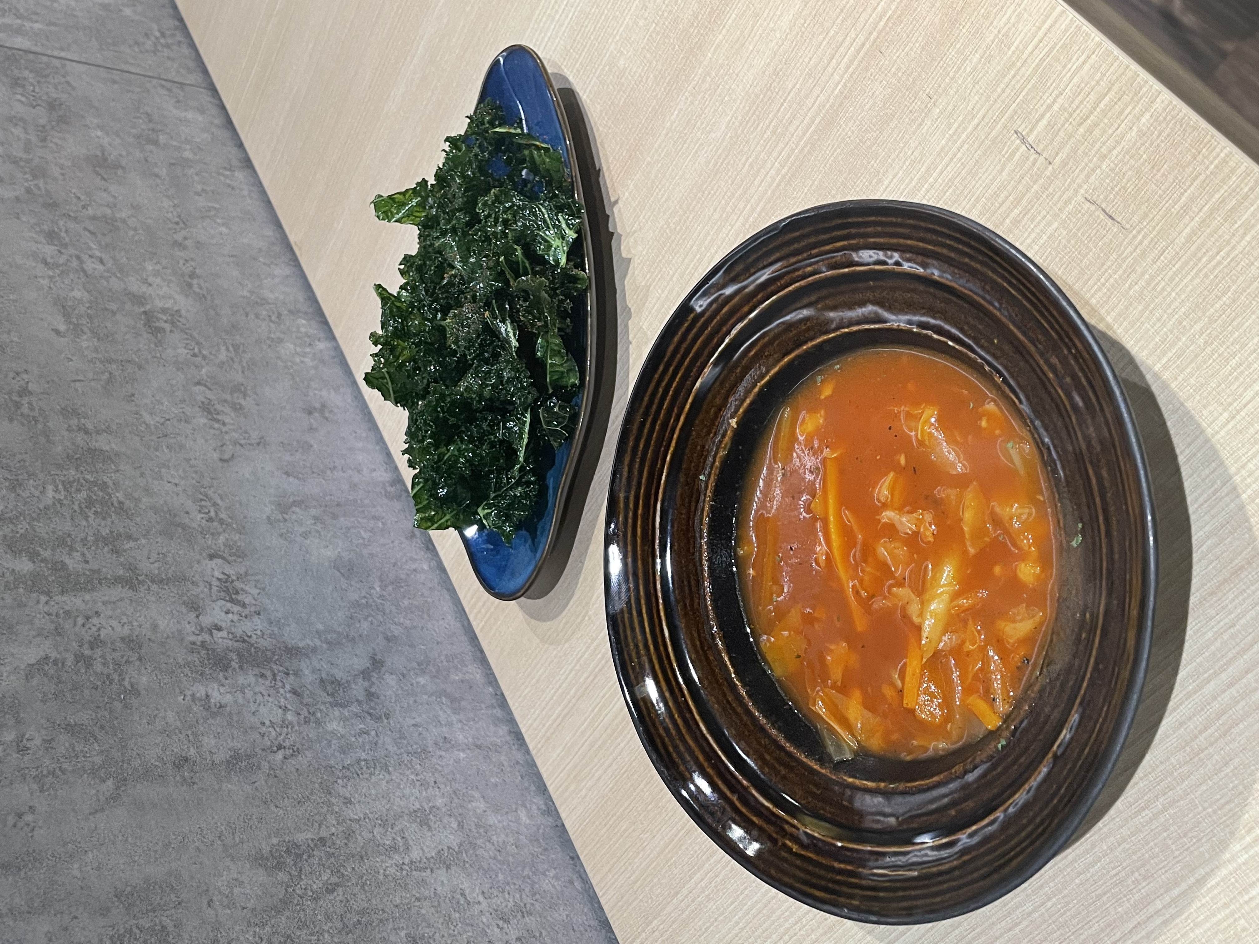 洋蔥湯(68HKD)及脆炸羽衣甘藍(68HKD)。