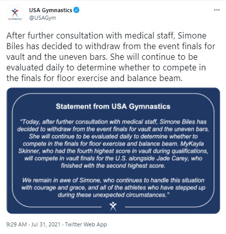 在與醫務人員進一步協商後,拜爾斯決定退出跳馬和高低杠決賽。她將繼續接受每日評估,以決定是否參加自由體操和平衡木決賽。