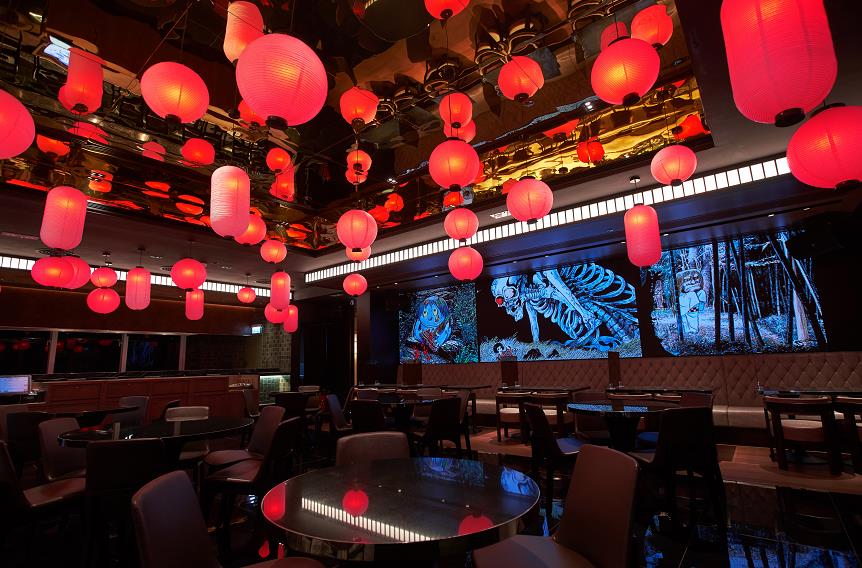 場內電子屏幕為妖怪的登場舞台,配上經典日式大紅燈籠,重現漫畫中的詭異氣氛。