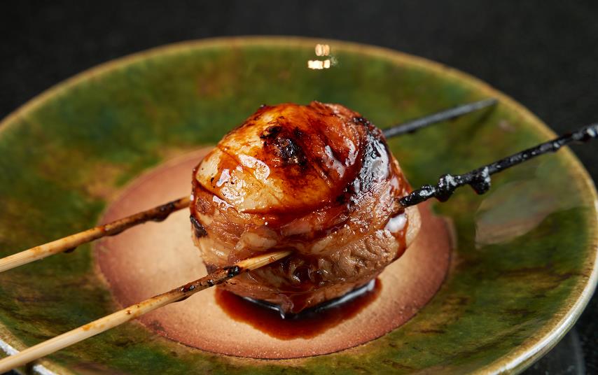 豚肉流心蛋卷(HK$45),將醬汁、豚肉油脂,裹覆著日本流心蛋,是店內招牌串燒菜式。