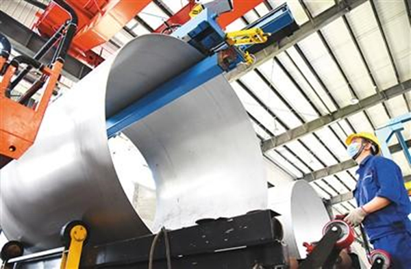 江蘇連雲港經濟技術開發區內,工人在特種裝備LNG壓力容器生產車間裏忙碌。