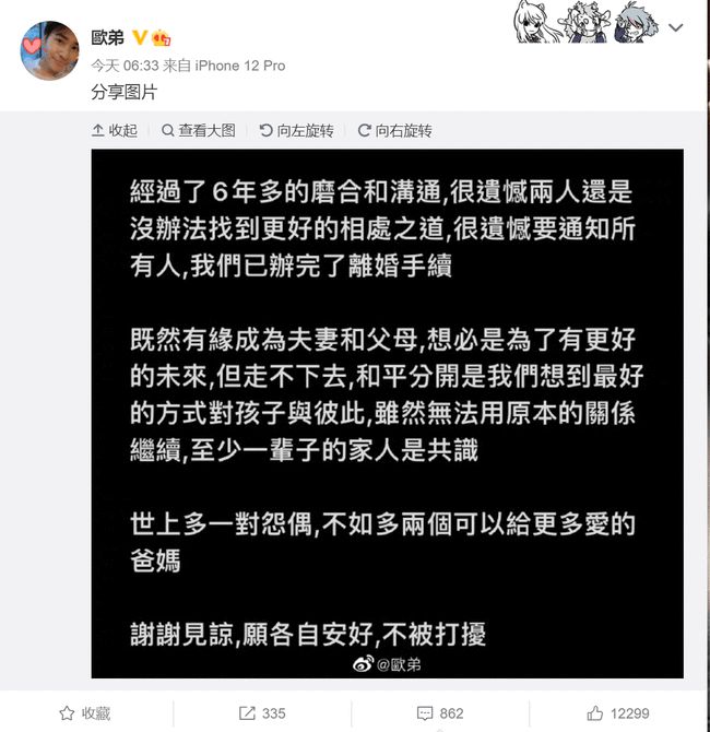 他在微博寫道:「經過了6年多的磨合和溝通,很遺憾兩人還是沒辦法找到更好的相處之道,很遺憾要通知所有人,我們已辦完了離婚手續。既然有緣成為夫妻和父母,想必是為了有更好的未來,但走不下去,和平分開是我們想到最好的方式對孩子與彼此,雖然無法用原本的關係繼續,至少一輩子的家人是共識。世上多一對怨偶,不如多兩個可以給更多愛的爸媽。謝謝見諒,願各自安好,不被打擾。」