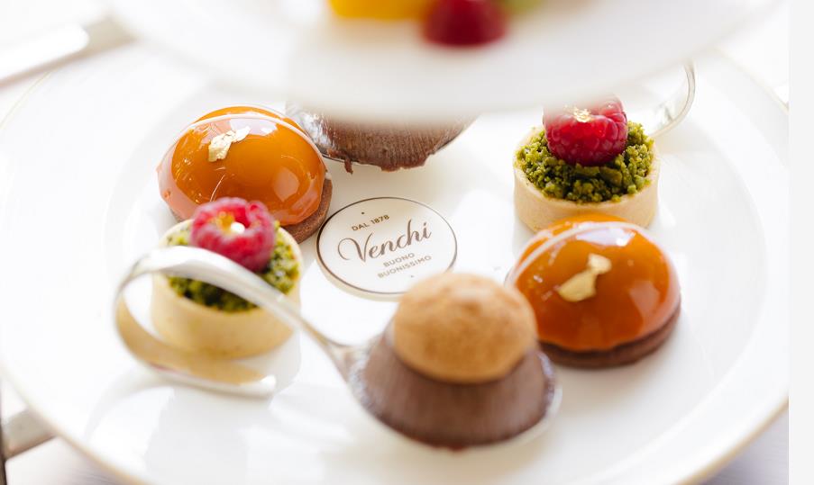 在視覺上,加入多種水果的甜點營造出繽紛的感覺,如:香橙朱古力蛋糕、黑朱古力覆盆子果撻,加上下午茶整體以橙色為主調,呈現一種熾熱而美好的幸福感。當然,最經典的是源於意大利皮埃蒙特地區的「意式黑朱古力布甸」,加入Venchi 56%黑朱古力的香濃可可,頂部綴以杏仁脆片,口感豐富。