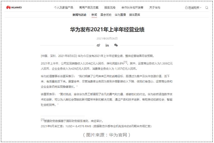8月6日華為發布2021年上半年經營業績並稱整體經營結果符合預期。