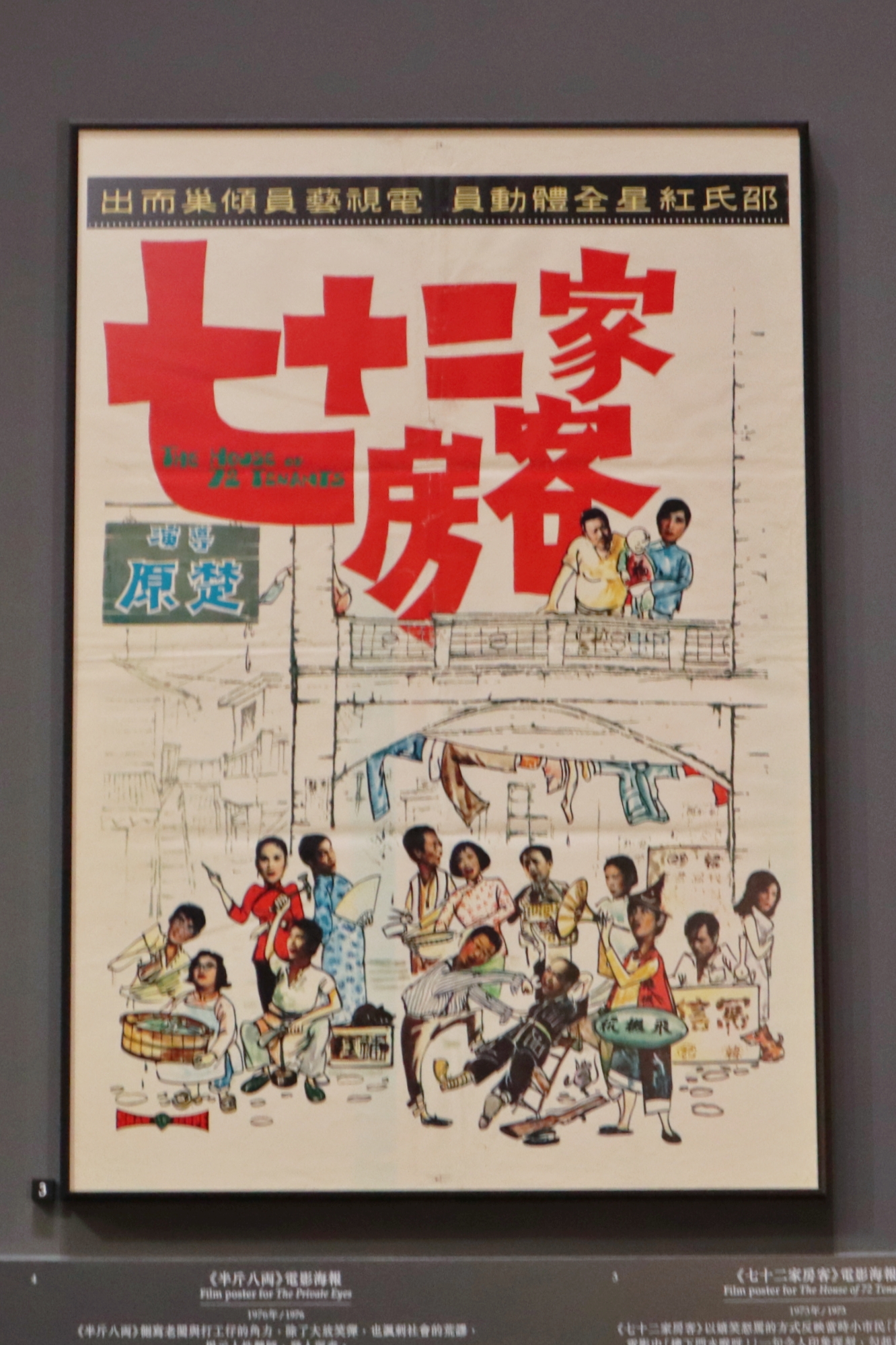 1970年代開始,本地電影文化百花齊放。展場中有不少電影海報真跡,有些更是海外版海報,日文、英文版電影海報足以反映香港電影在海外有多受歡迎。當中「《七十二家房客》電影海報」極具意義,這部電影匯聚上世紀70年代的影視界明星,成為當年賣座冠軍,在國語電影流行的年代,令停產多時的粵語電影再受重視,並成為本地電影主流的奠基作品,具有劃時代意義。