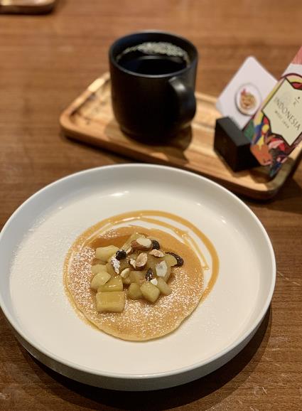 手沖咖啡是工作坊的最後一環,以印尼西爪哇島咖啡製作配搭肉桂焦糖蘋果鬆餅,兩者的配搭昇華了各自的風味,特別是堅果的味道加深了咖啡醇厚度。咖啡師亦會教授品味咖啡的四個步驟: