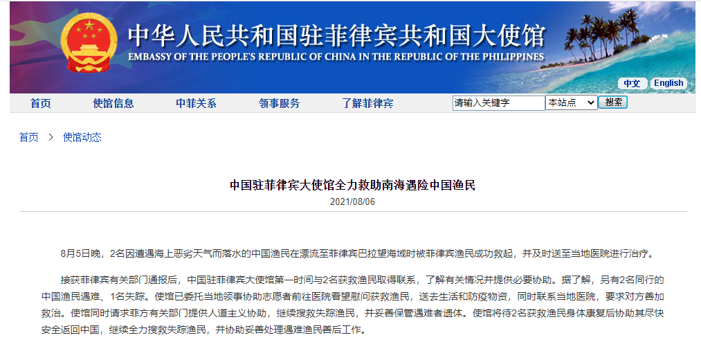 據中國駐菲律賓大使館網站消息,8月5日晚,2名因遭遇海上惡劣天氣而落水的中國漁民在漂流至菲律賓巴拉望海域時被菲律賓漁民成功救起,並及時送至當地醫院進行治療。接獲菲律賓有關部門通報後,中國駐菲律賓大使館第一時間與2名獲救漁民取得聯繫,了解有關情況並提供必要協助。