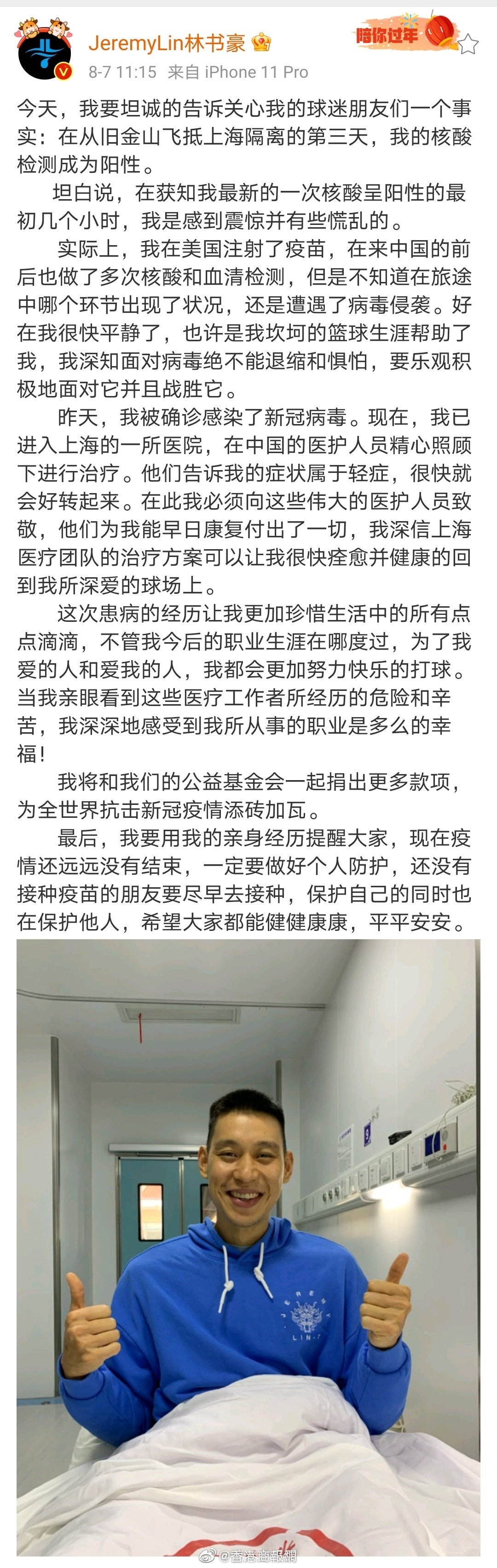 林書豪透露,自己屬於輕症患者,目前已經進入上海的一所醫院隔離治療。他也通過聲明向醫護人員致敬,「他們為我能早日康復付出了一切,我深信上海醫療團隊的治療方案可以讓我很快痊癒並健康的回到我所深愛的球場上。」