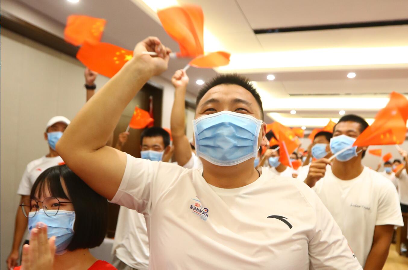 「太激動了!太高興了!」看到徐詩曉/孫夢雅的皮艇率先衝過終點線,徐詩曉的丈夫宋鵬華揮舞國旗、振臂高呼,整個人幾乎要跳起來。